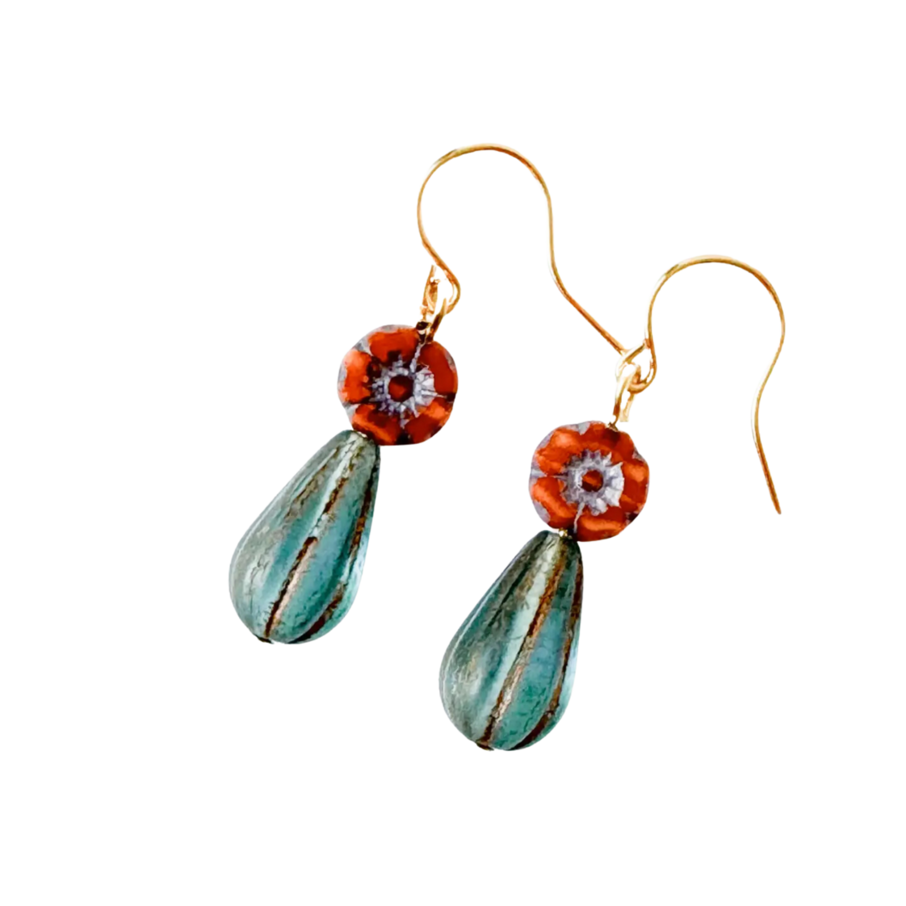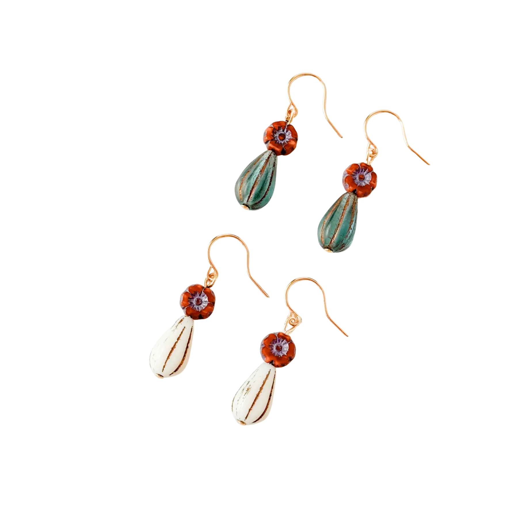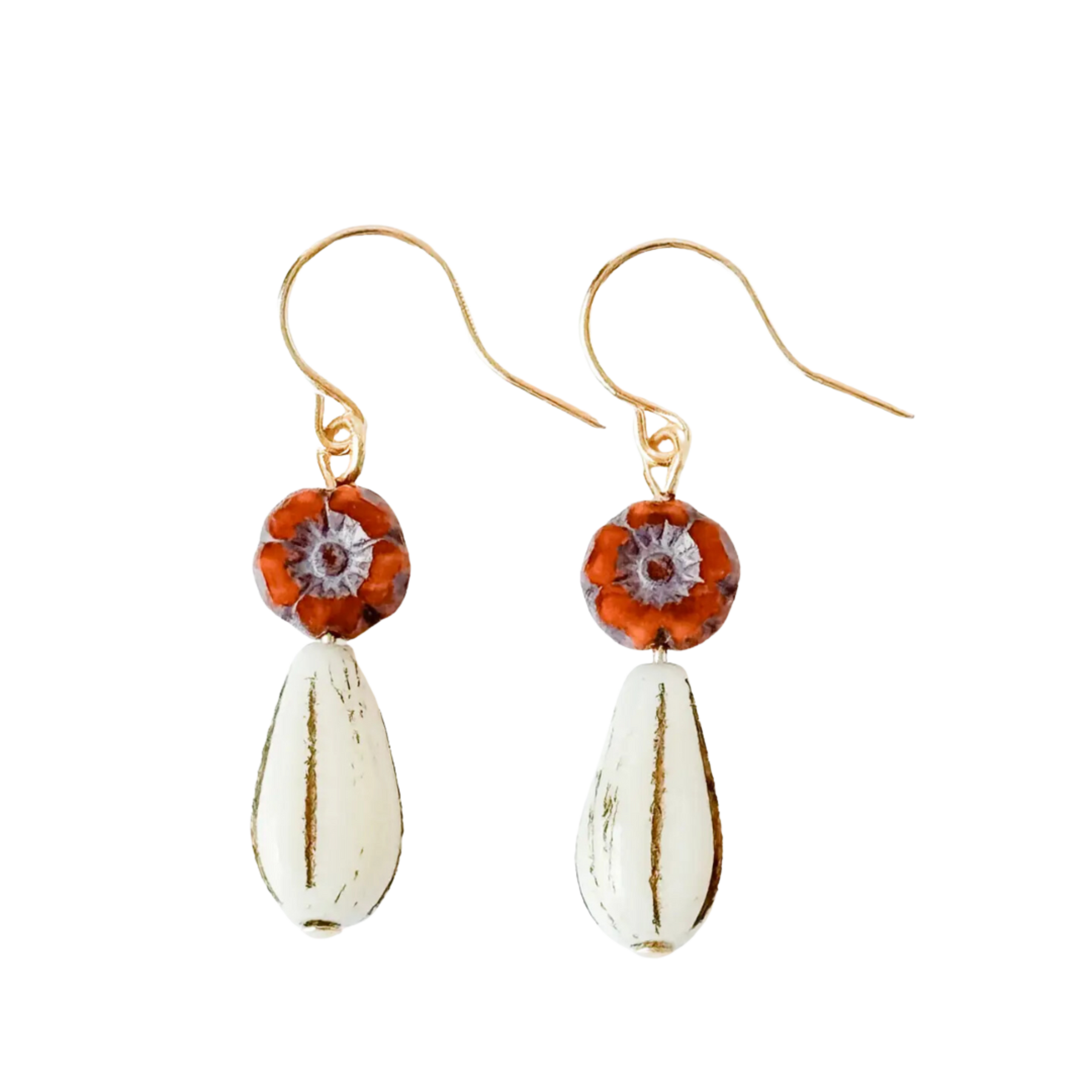 Small but full of charm, these Tiny Flower and Bead Earrings are the perfect everyday accessory with a cozy seasonal twist. Each pair features a 5mm rust-colored glass flower paired with rich glass beads in fall/winter tones, all finished with 24K gold-plated ear wires. At just 3/4" long, they’re lightweight, dainty, and effortlessly cute.