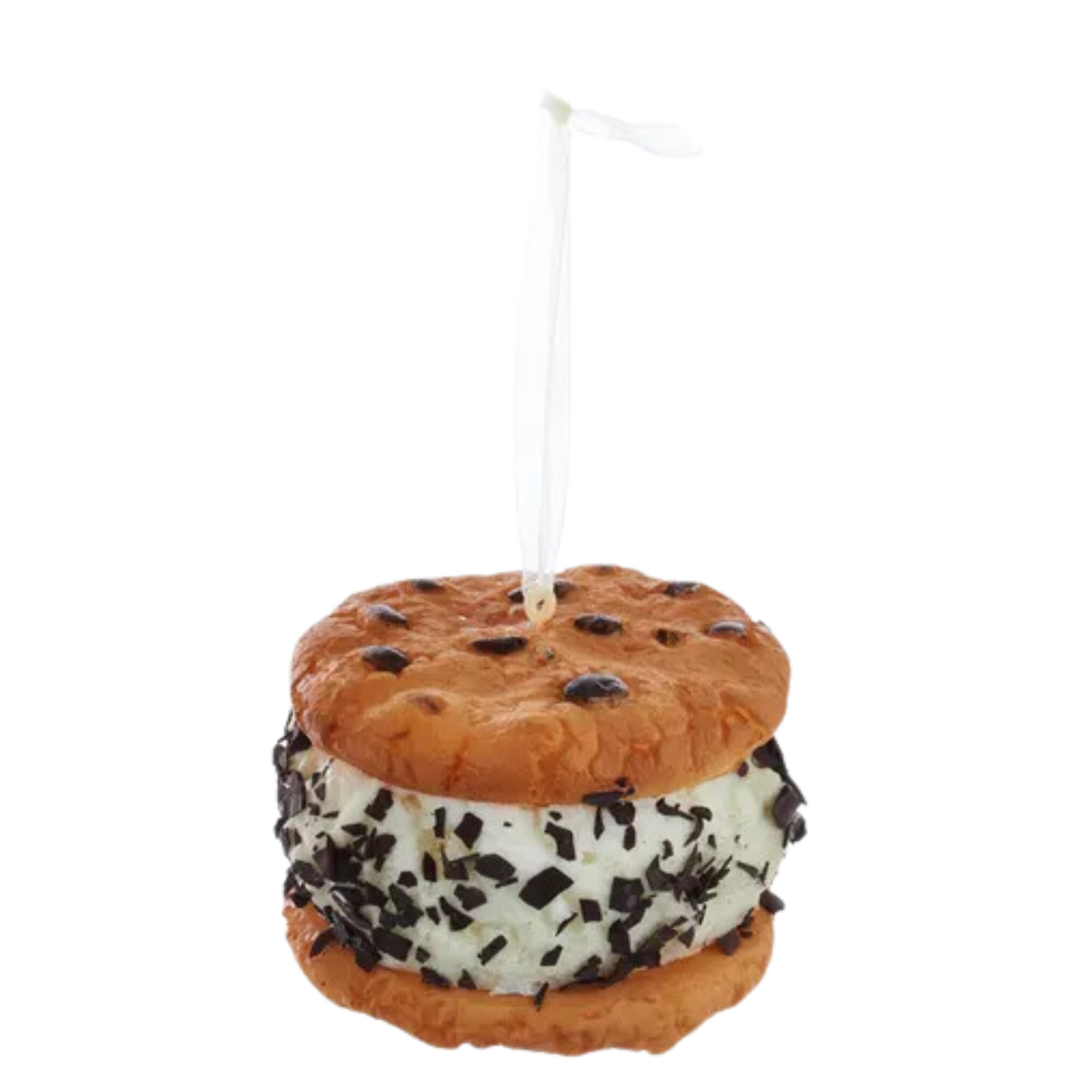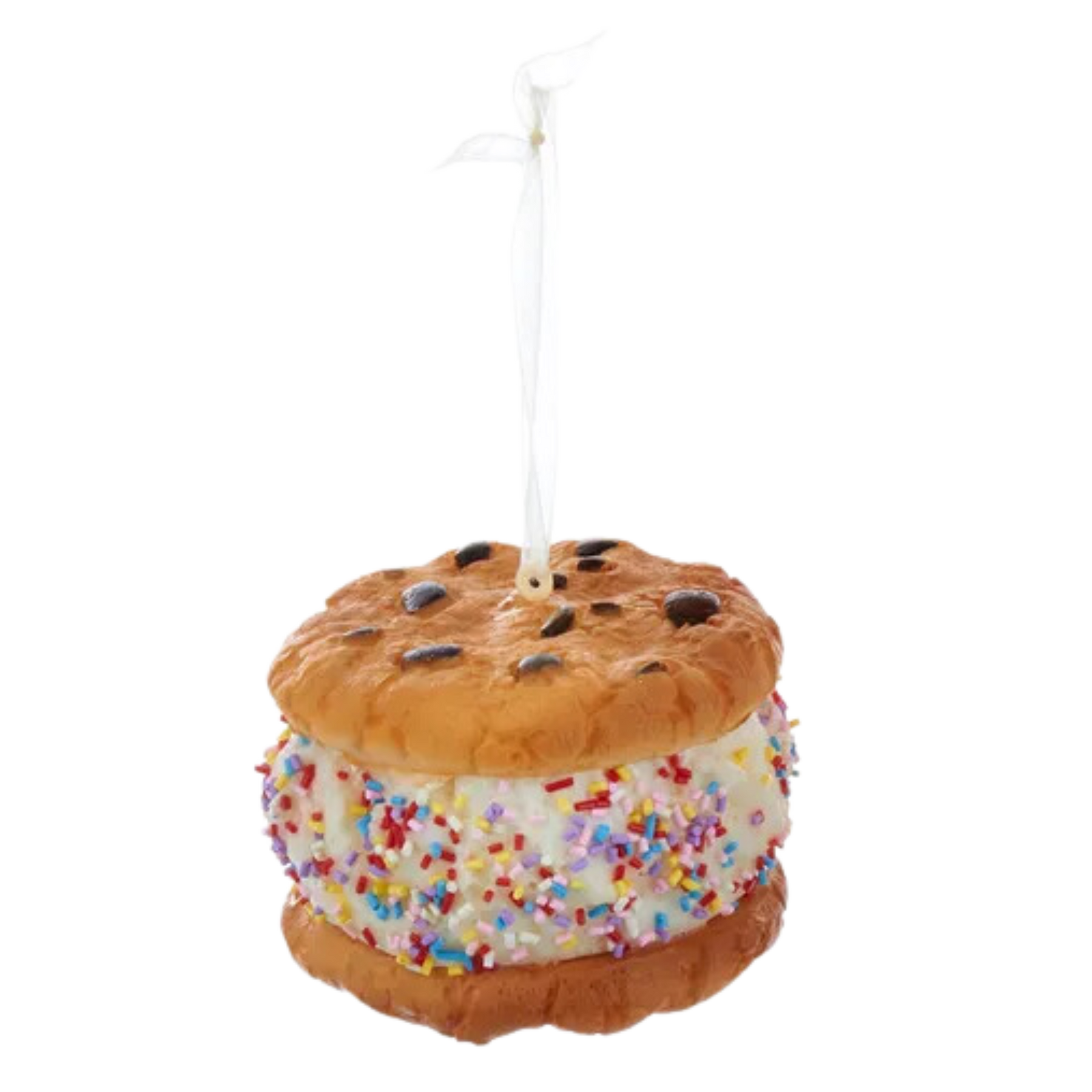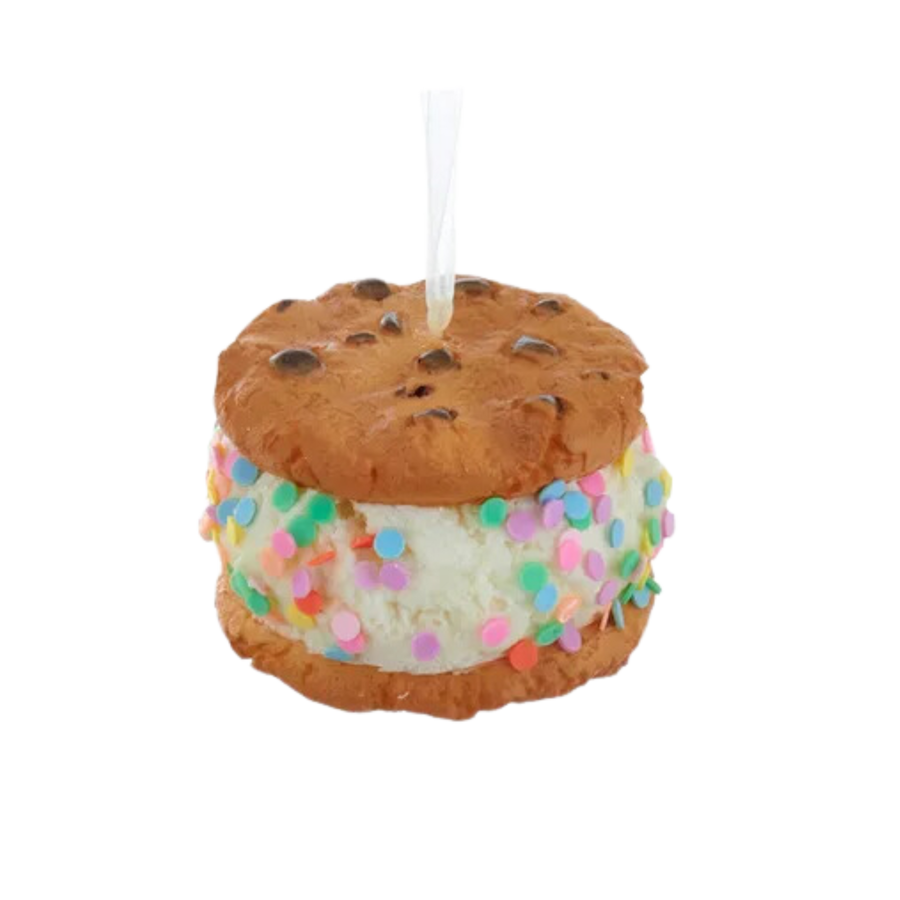 Add some sweetness to any holiday decor or Christmas tree with these Kurt Adler ice cream sandwich ornaments. Each ornament features ice cream in between two chocolate chip cookies made of realistic looking polyurethane. This assortment includes vanilla ice cream with multi-colored colored sprinkles, multi-color confetti sprinkles and chocolate shavings.