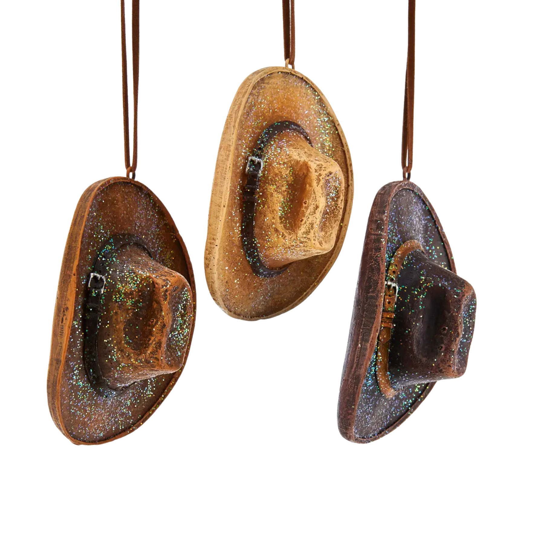 Celebrate the wild west with Kurt Adler's cowboy hat ornaments. Included in this assortment of glittered cowboy hats are the colors tan, light brown and dark brown.