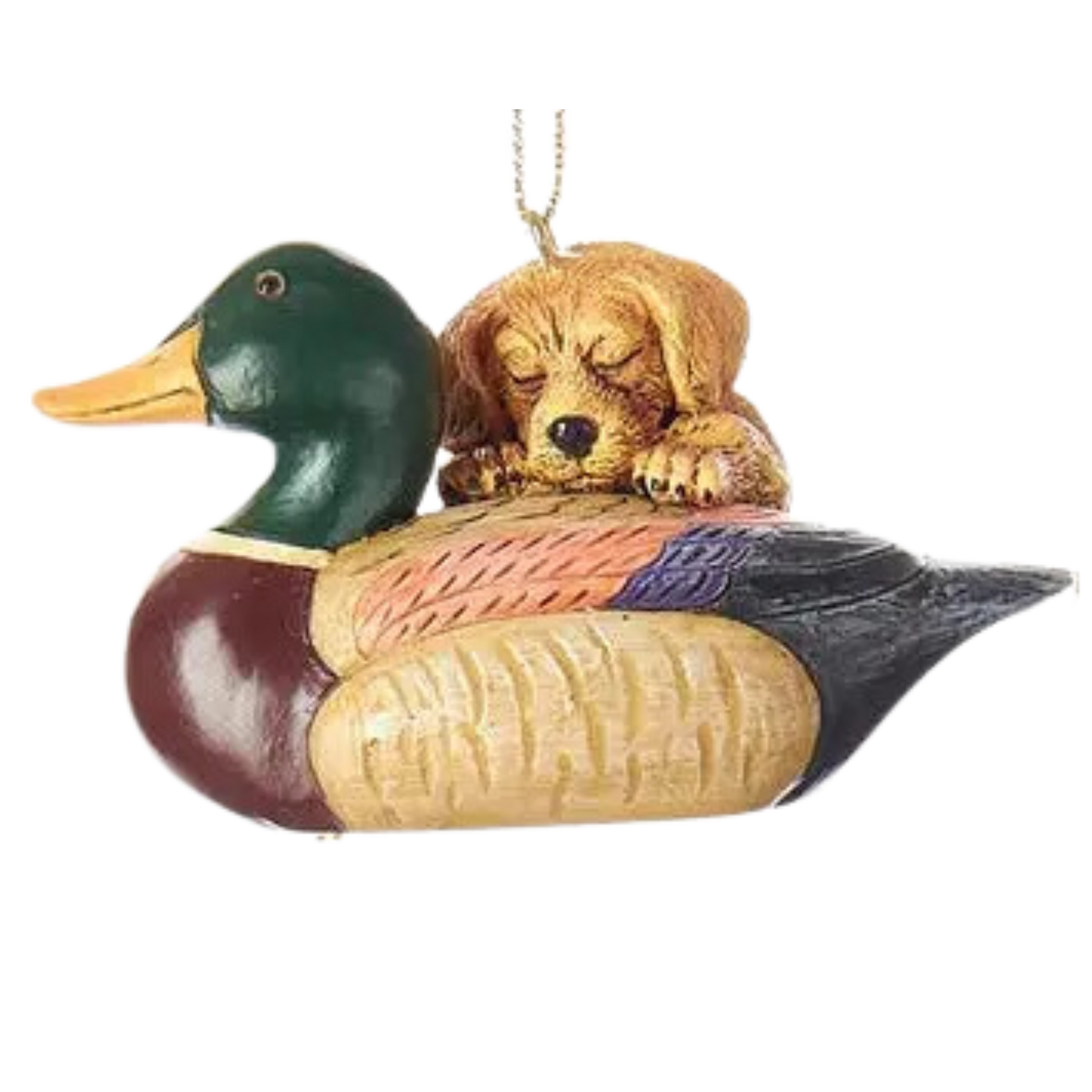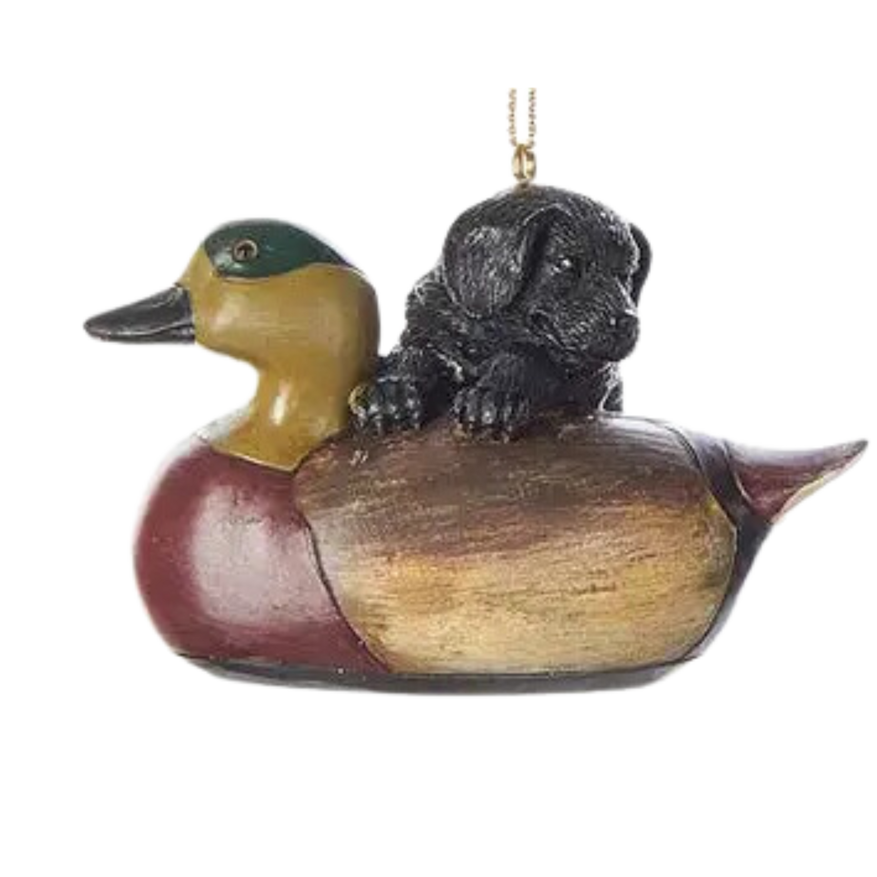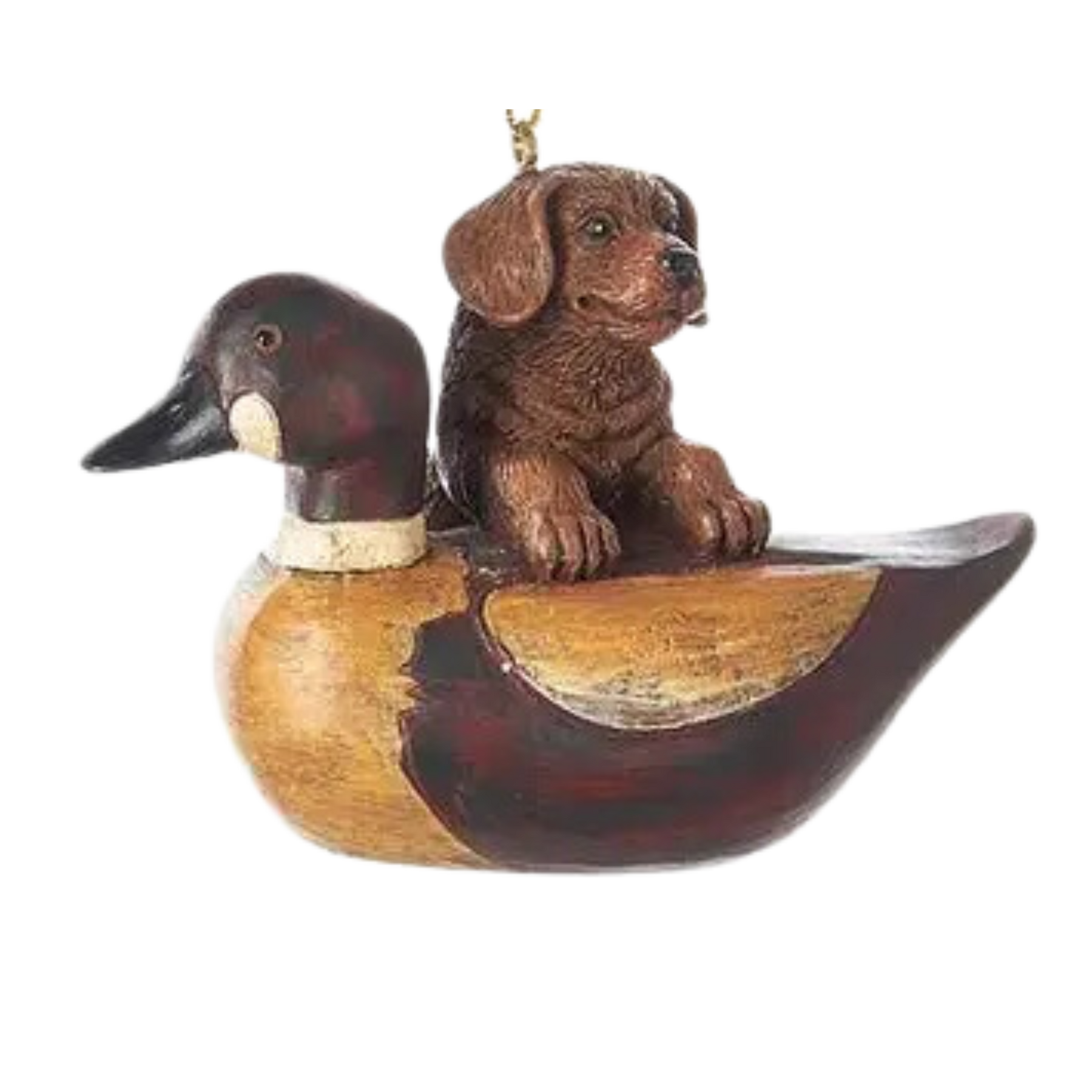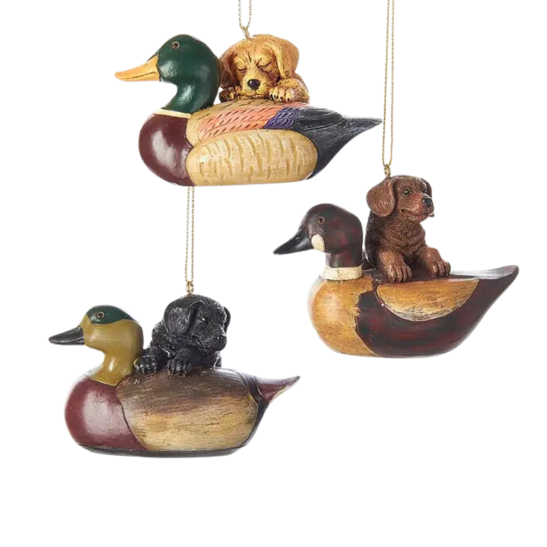 Puppy W/Duck Decoy ornament - 3 Assorted: Brown, Tan and Black