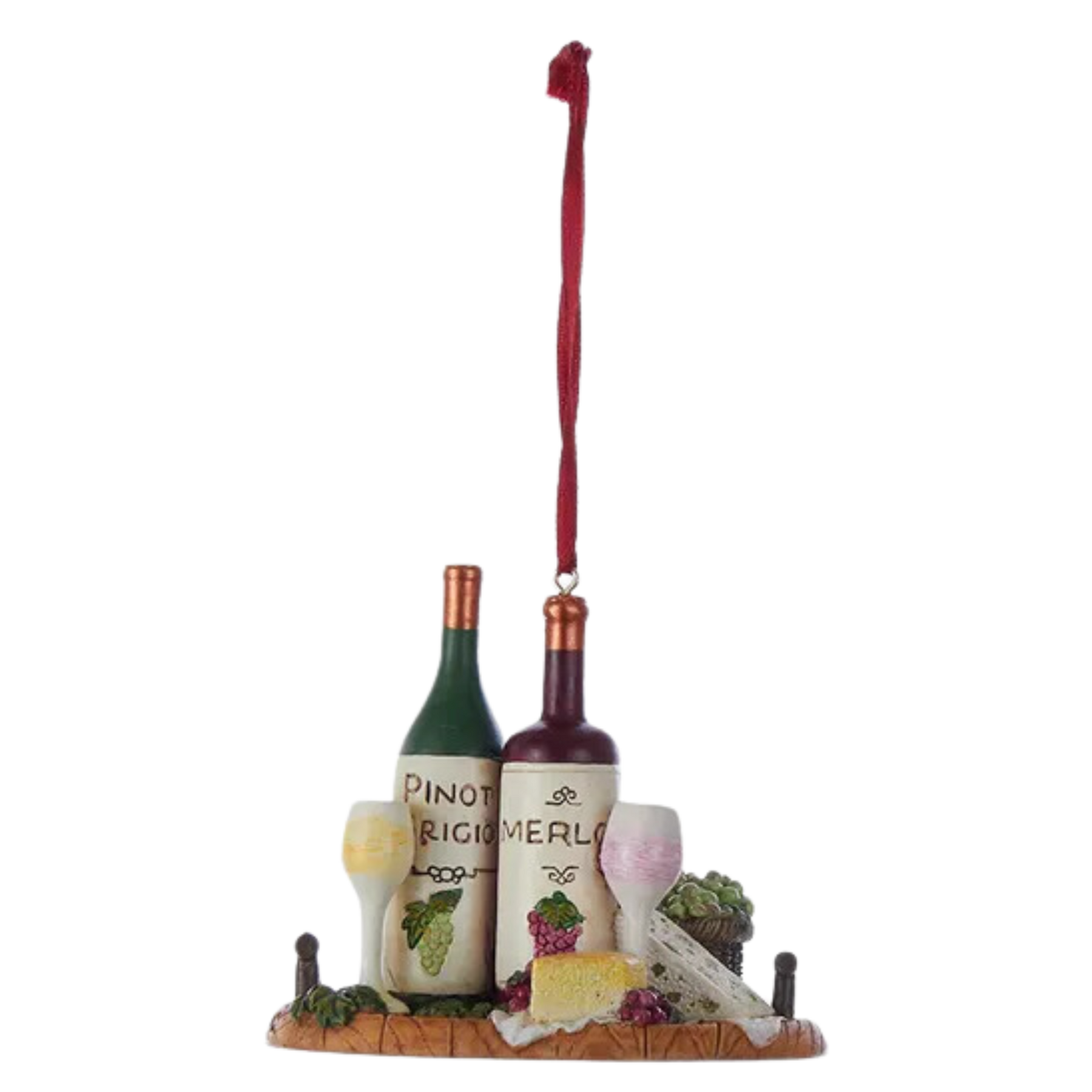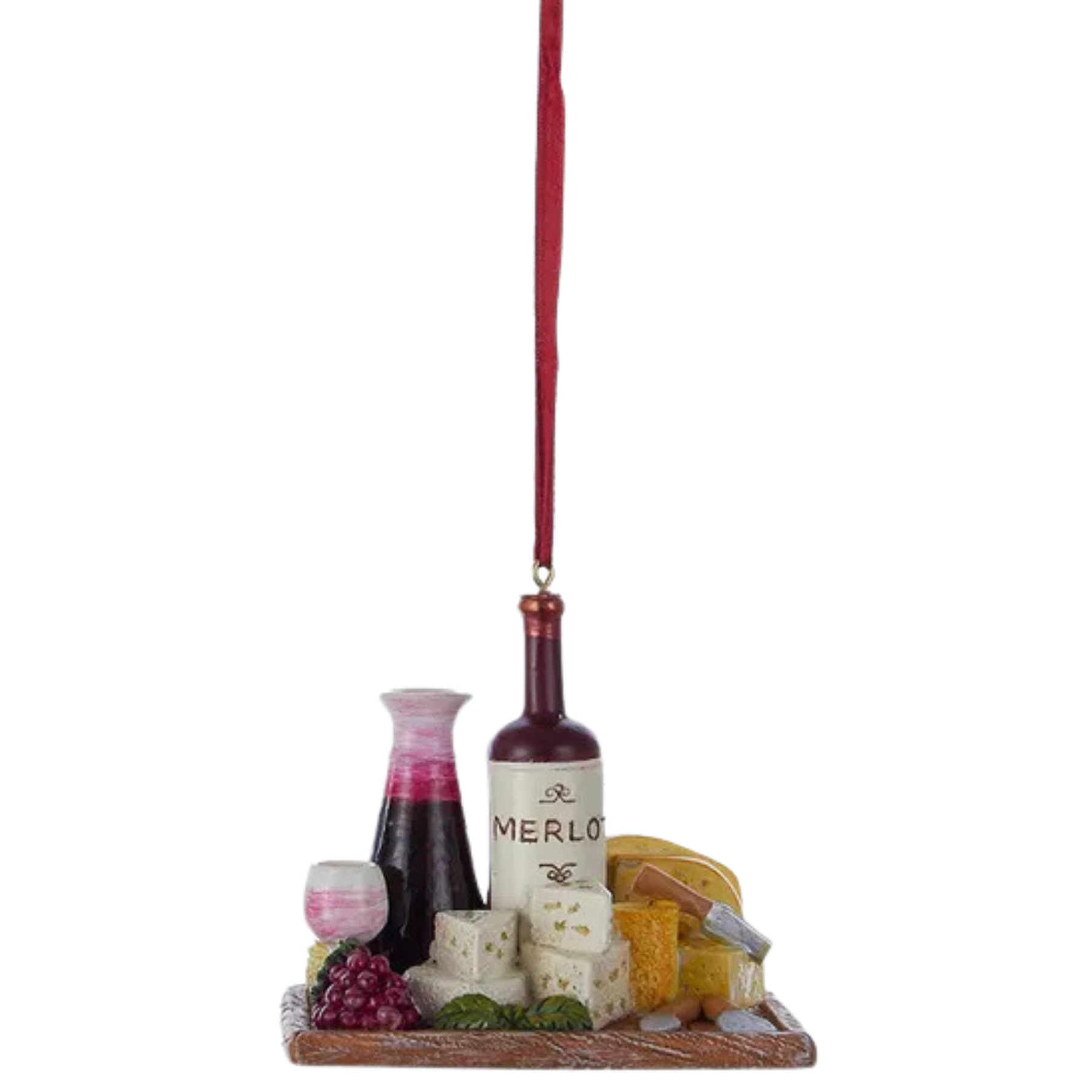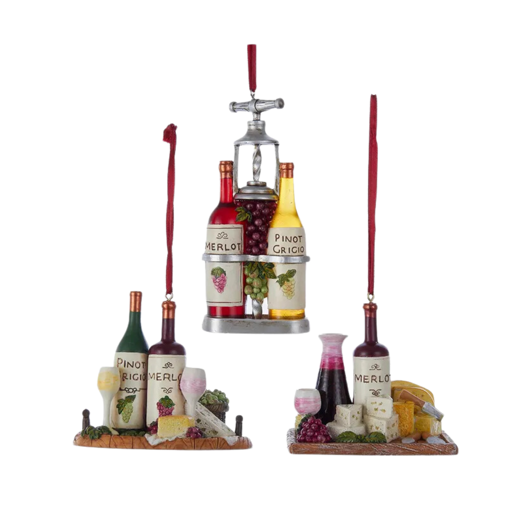 It's never too early when it's "wine o' clock!" Celebrate the good times with our wine and cheese tray ornaments from Kurt Adler! This assortment features three ornaments of merlot with pinot grigio and one features merlot with an abundance of assorted cheeses.