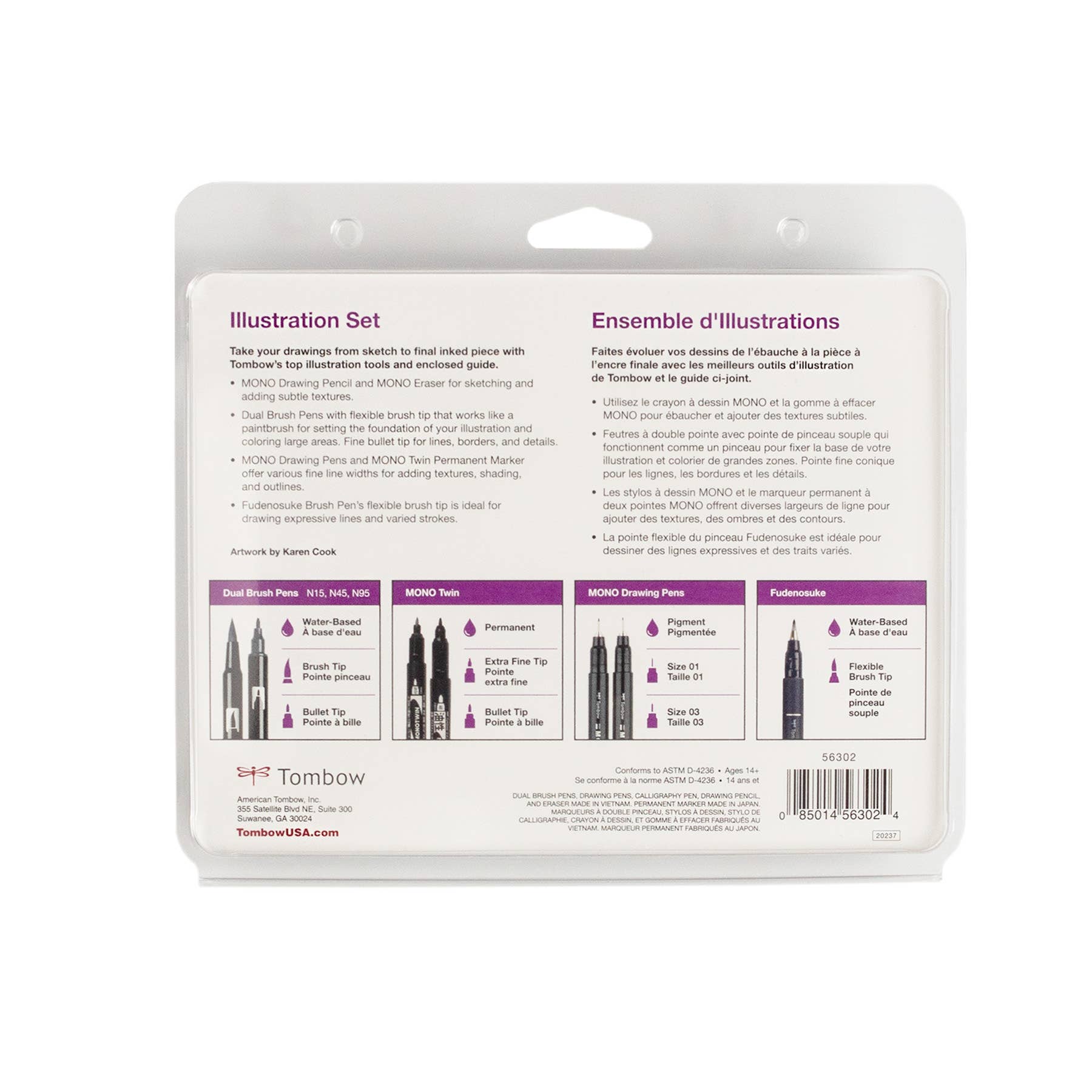 Tombow Illustration Set includes all the tools you need to create pen & ink drawings, sketches and illustrations. Contains instructional guide with helpful tips on basic drawing techniques, layering, value and composition. Features Dual Brush Pen art marker with flexible brush tip and fine tip in one. Set includes three Dual Brush Pens, two MONO Drawing Pens, Fudenosuke Brush Pen, MONO Twin Permanent Marker, MONO Drawing Pencil H and MONO Eraser. • 3 Dual Brush Pen art markers with flexible brush tip and fine tip (N95 Cool Gray 1, N45 Cool Gray 10, N15 Black) • MONO Drawing Pen water-based pigment ink (01 and 03 tip sizes) • Fudenosuke Brush Pen with pigmented water-based ink and flexible brush tip • Permanent marker with black ink and two tips – broad tip and fine point • Smudge-proof graphite pencil • Premium plastic eraser