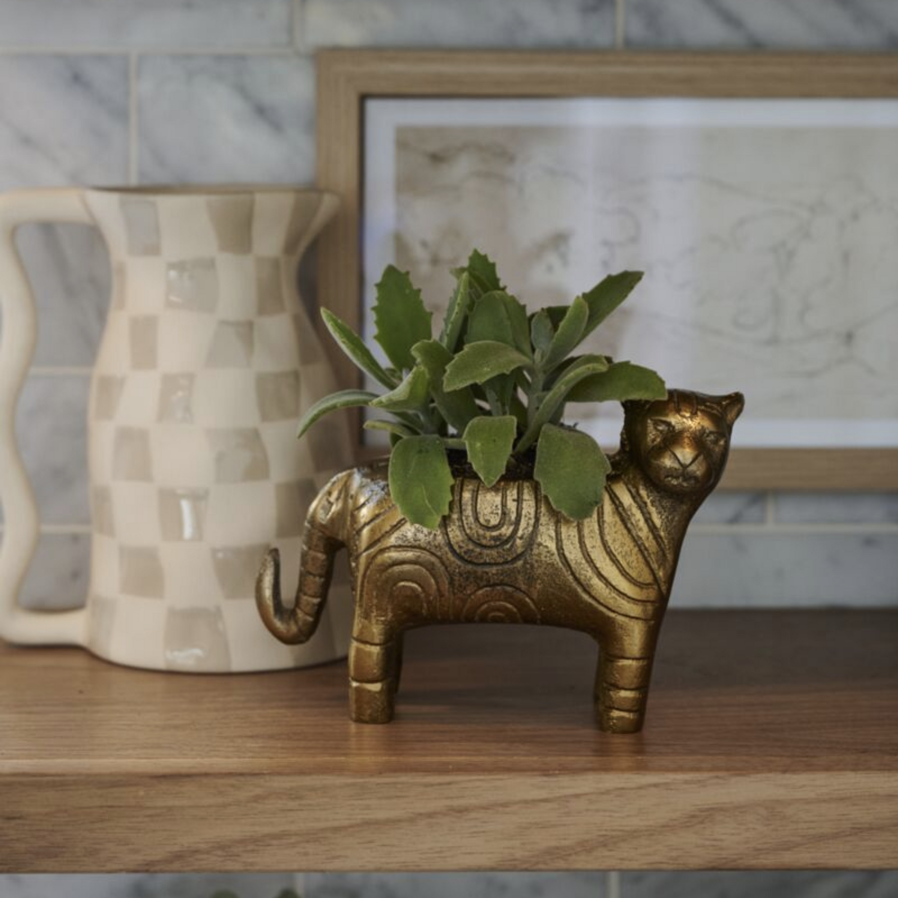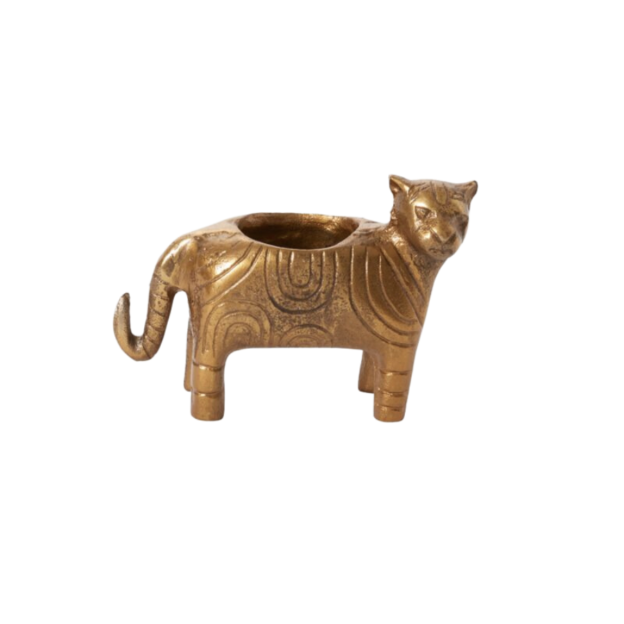 Behold the whimsical charm of the Tiger Pot, a recycled cast aluminum curiosity. This watertight piece is designed to fit a 2-inch drop-in pot, or it can be used as a decorative piece with an air plant or nothing at all on a desk or bookshelf. Crafted from a hand-carved mold, this sculptural vessel with its antique gold finish showcases handcrafted artistry & timeless beauty in every detail.