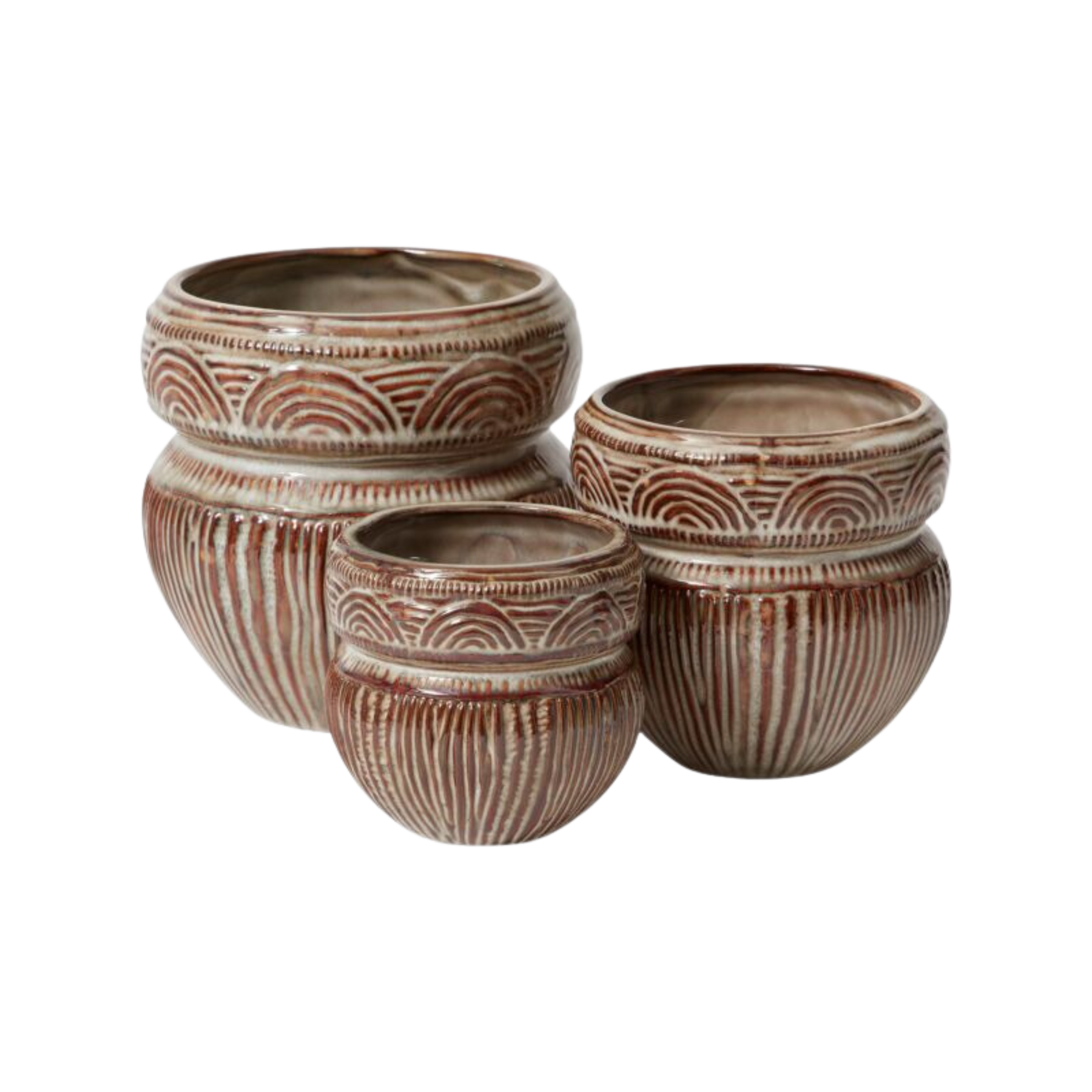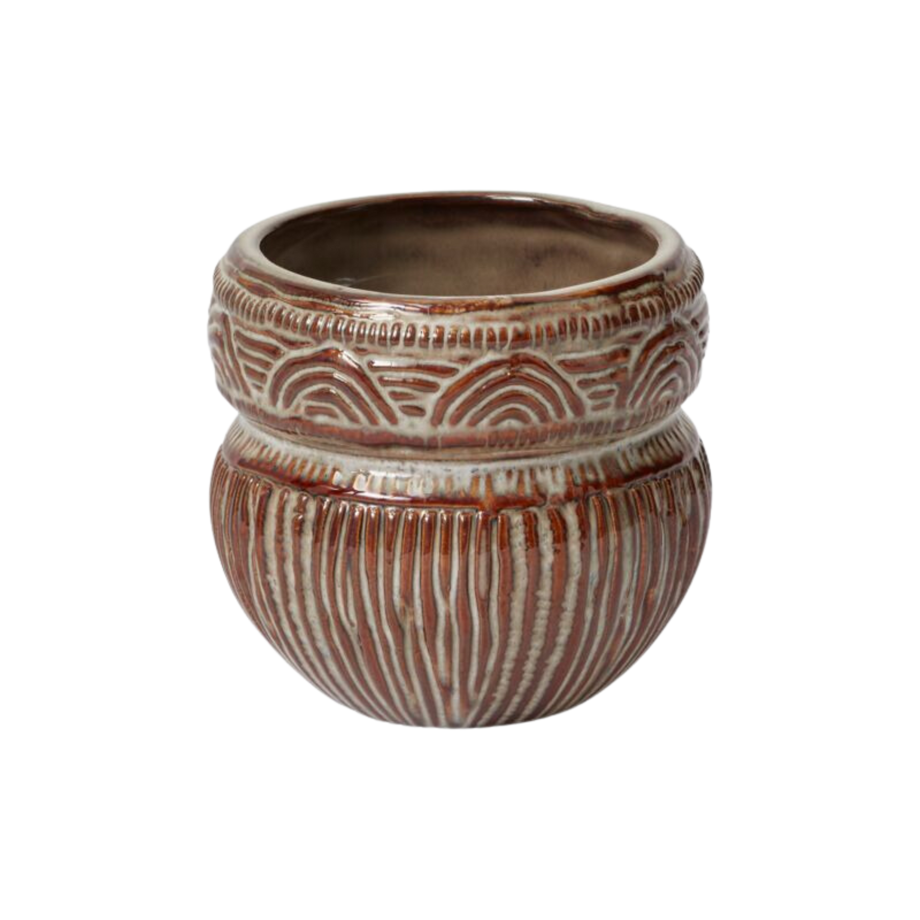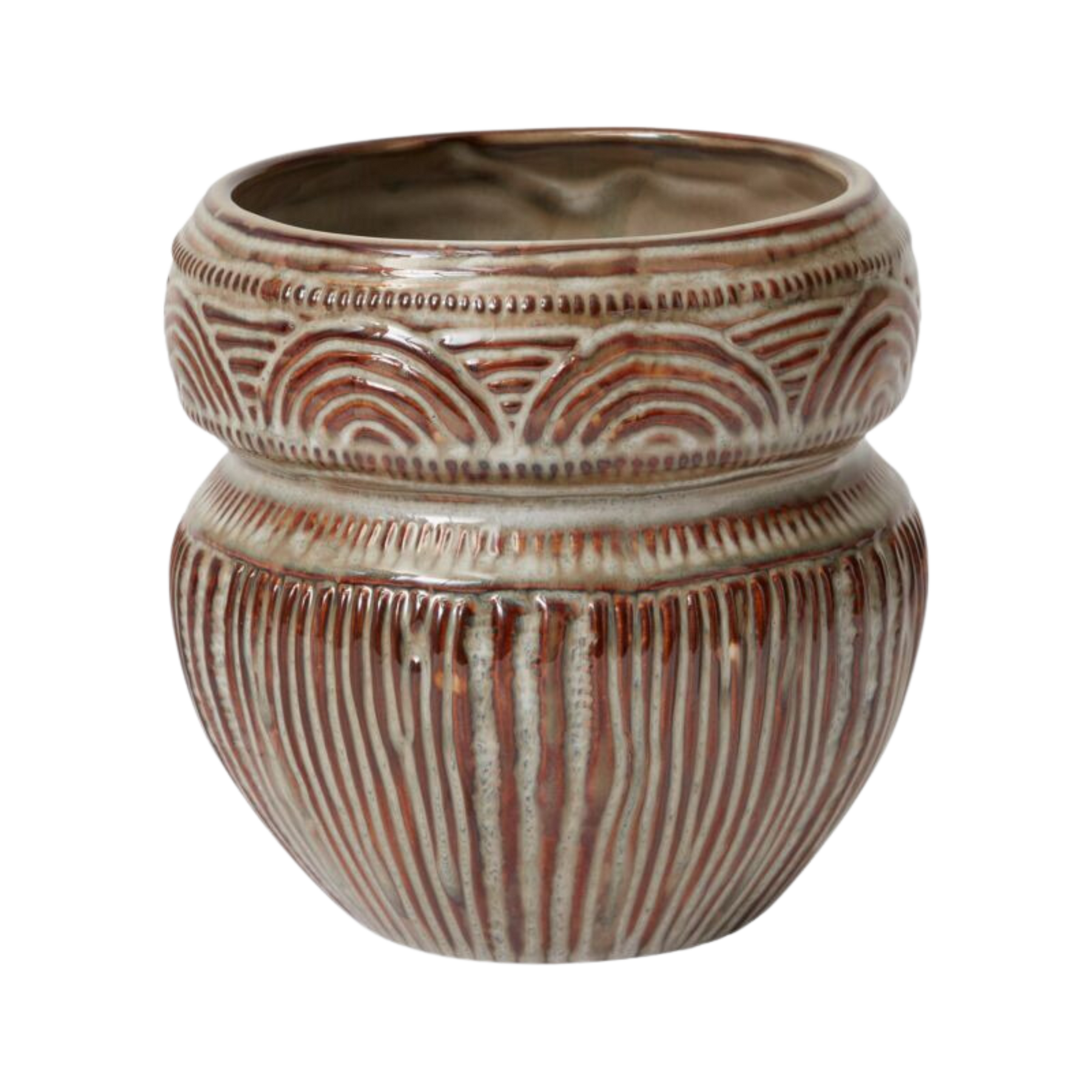 Taking inspiration from antique pattern and shape, the gorgeous glazed Langston Pot will add an elegant touch to your favorite plants. Their earthy, neutral tones and playful yet subtle pattern can fit with any decor, making them an easy addition to every home or shelf.