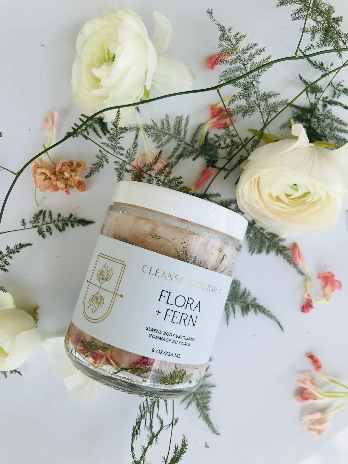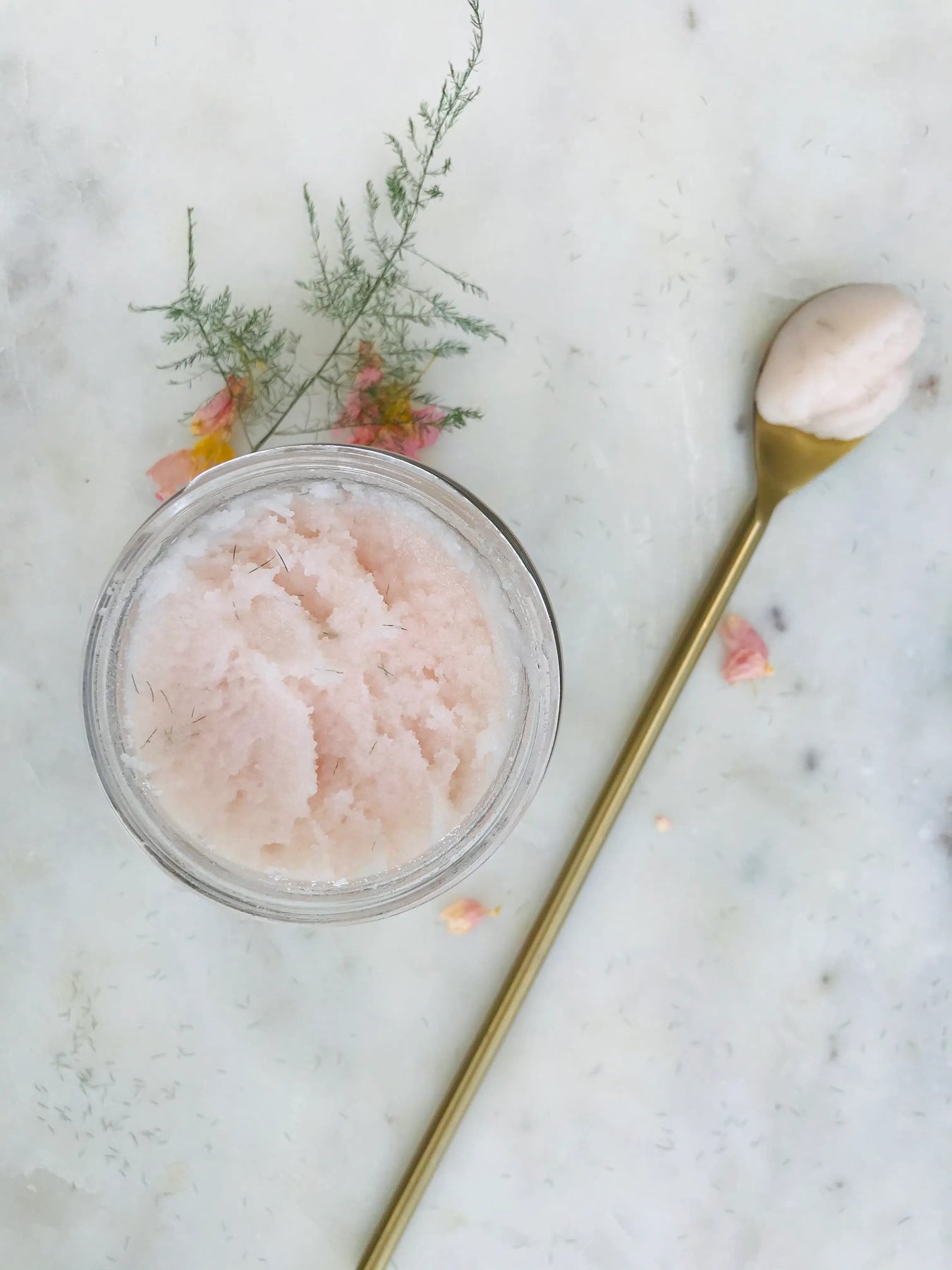 Powdered pink Himalayan salts infused with organic oils of ylang ylang + peppermint + wild orange + lavender + rosemary + camellia seed oil will exfoliate and soften for glowing skin.