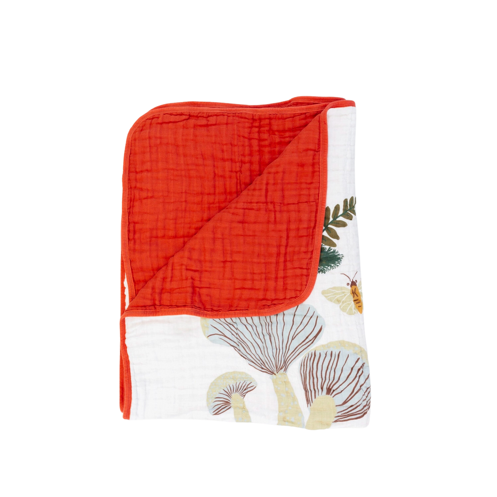 This throw blanket is perfect for a big kid bed (fits nicely on a twin!) or curling up with a cutie and getting cozy on the couch. On one side, you'll find an assortment of the cutest mushrooms you can forage and on the other, a cheerful and rusty red color.