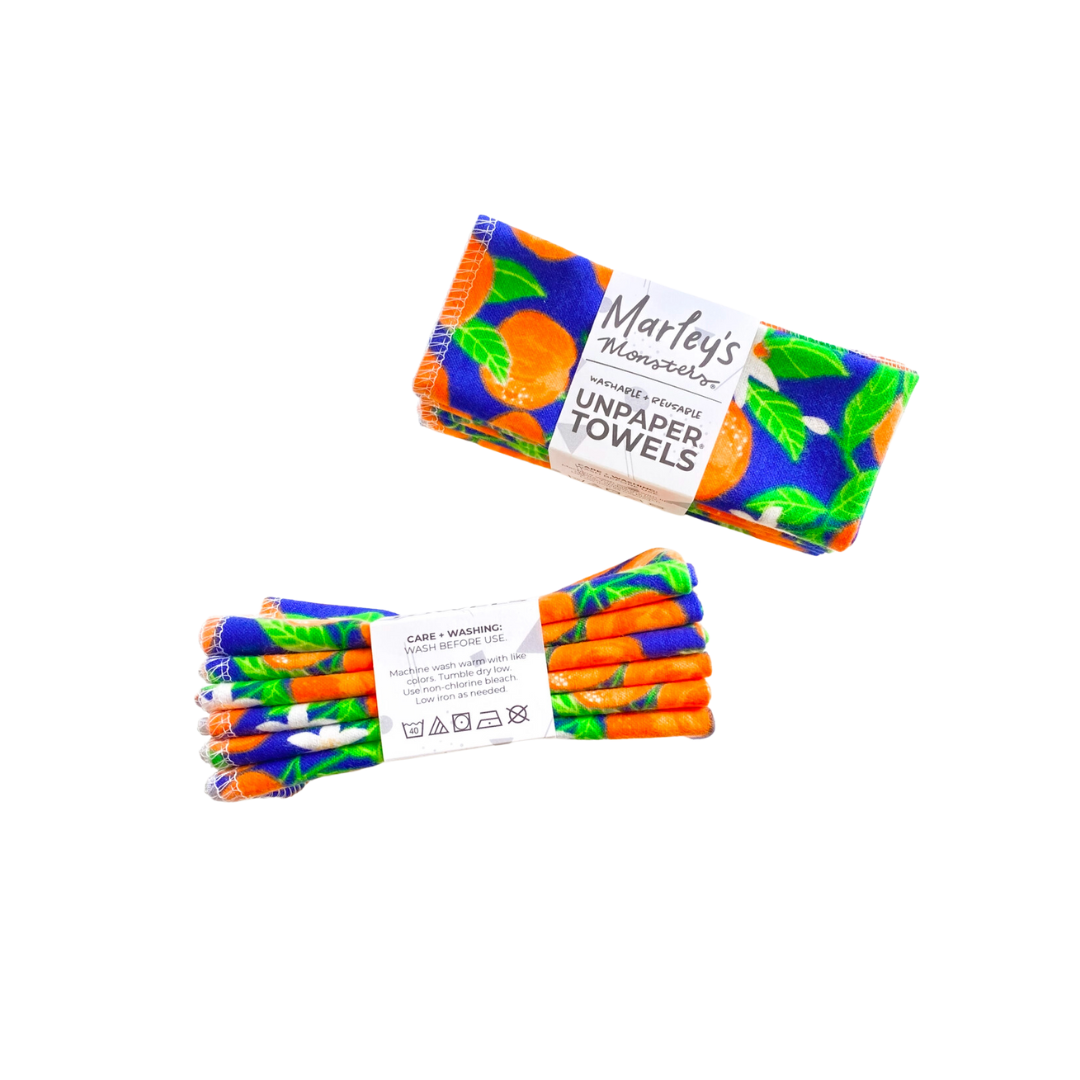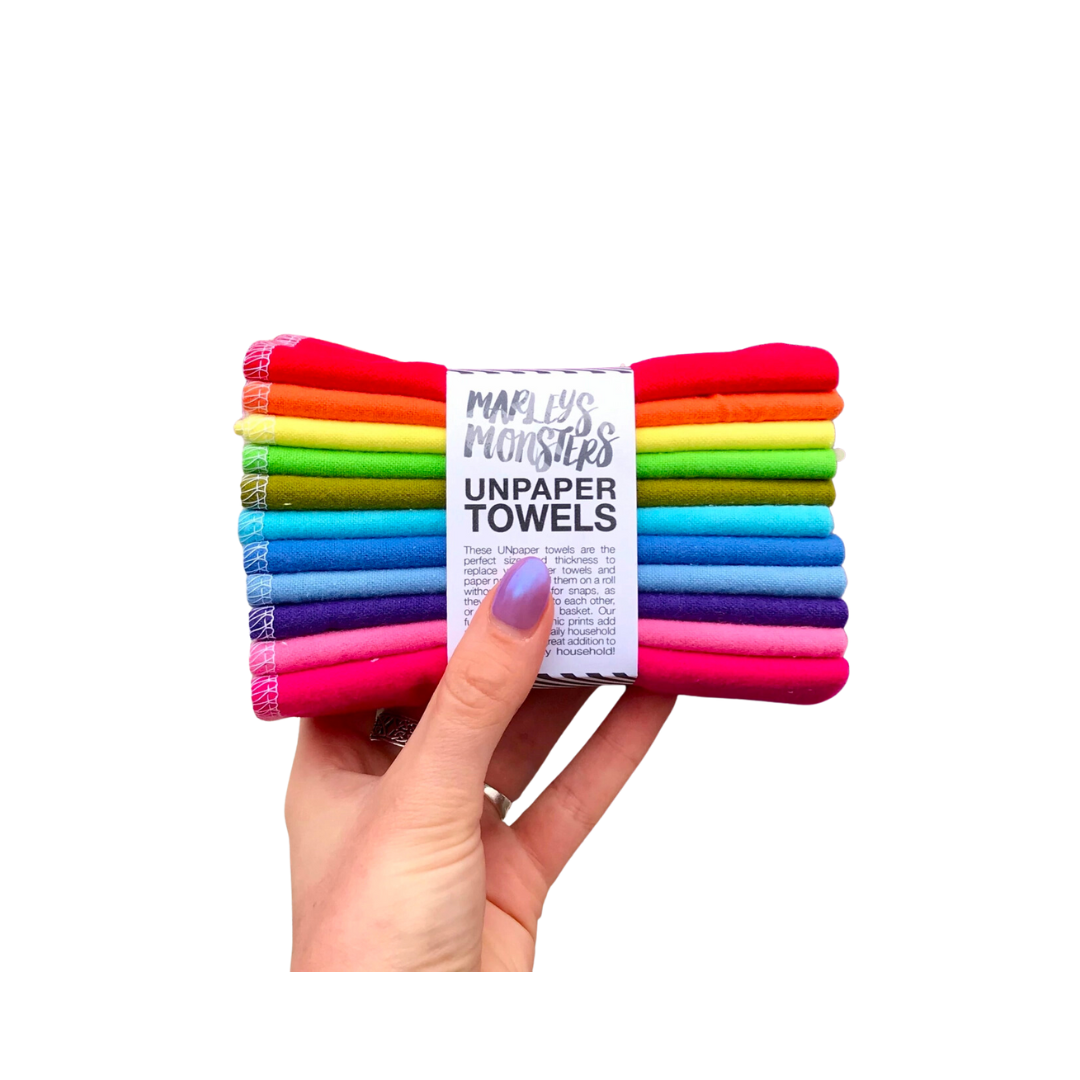 UNpaper® Towels are an ideal alternative to disposable paper towels and napkins. Add a splash of color to your daily household tasks with this set of solid-colored towels. The size of 12"x10". Crafted from 100% cotton flannel, these towels are enduring and designed not to fray, with increased absorbency after a few washes. UNpaper® Towels easily attach and roll onto a paper towel holder without snaps. Machine wash with like colors, then tumble dry. Handmade in Eugene, Oregon by Marley's Monsters.