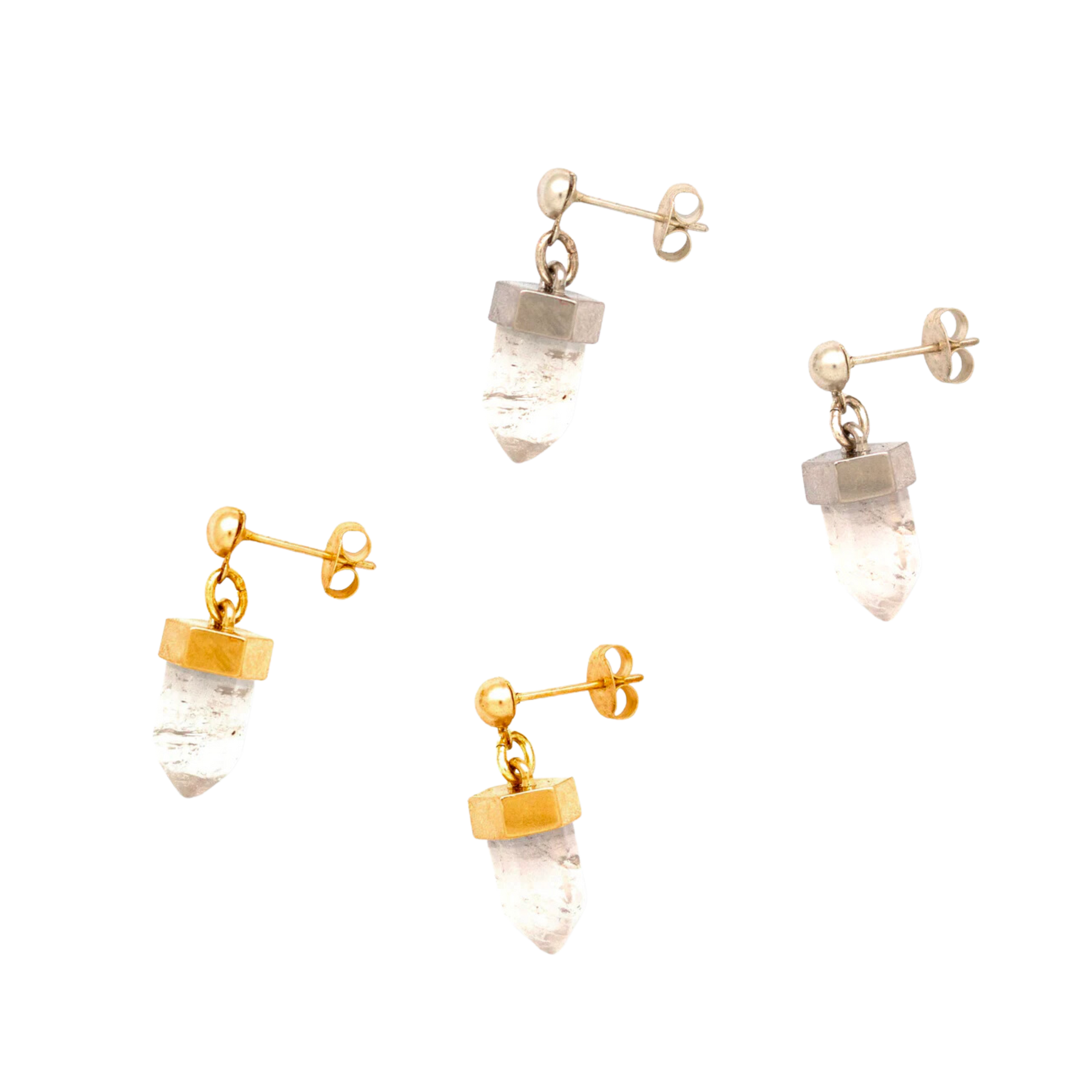 Crystal settings are Silver or Gold plated brass and posts are Silver or Gold plated surgical steel.