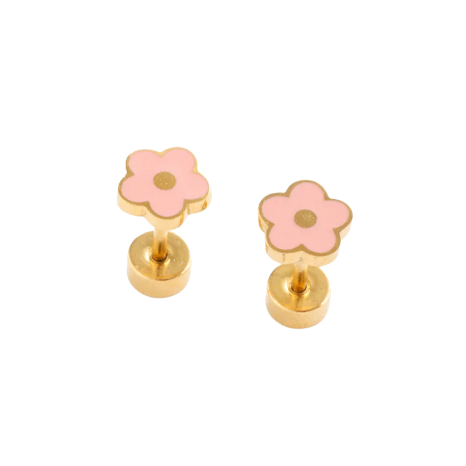 Delicate and dainty, the Petite Flower Stud Earring features a charming pink or white enamel bloom set in hypoallergenic 18k gold. With a comfy flat screw back, it's perfect for babies, toddlers, kids, teens, and adults alike. Waterproof, tarnish-proof, and designed for sensitive ears, this tiny floral is all about everyday charm with zero fuss.