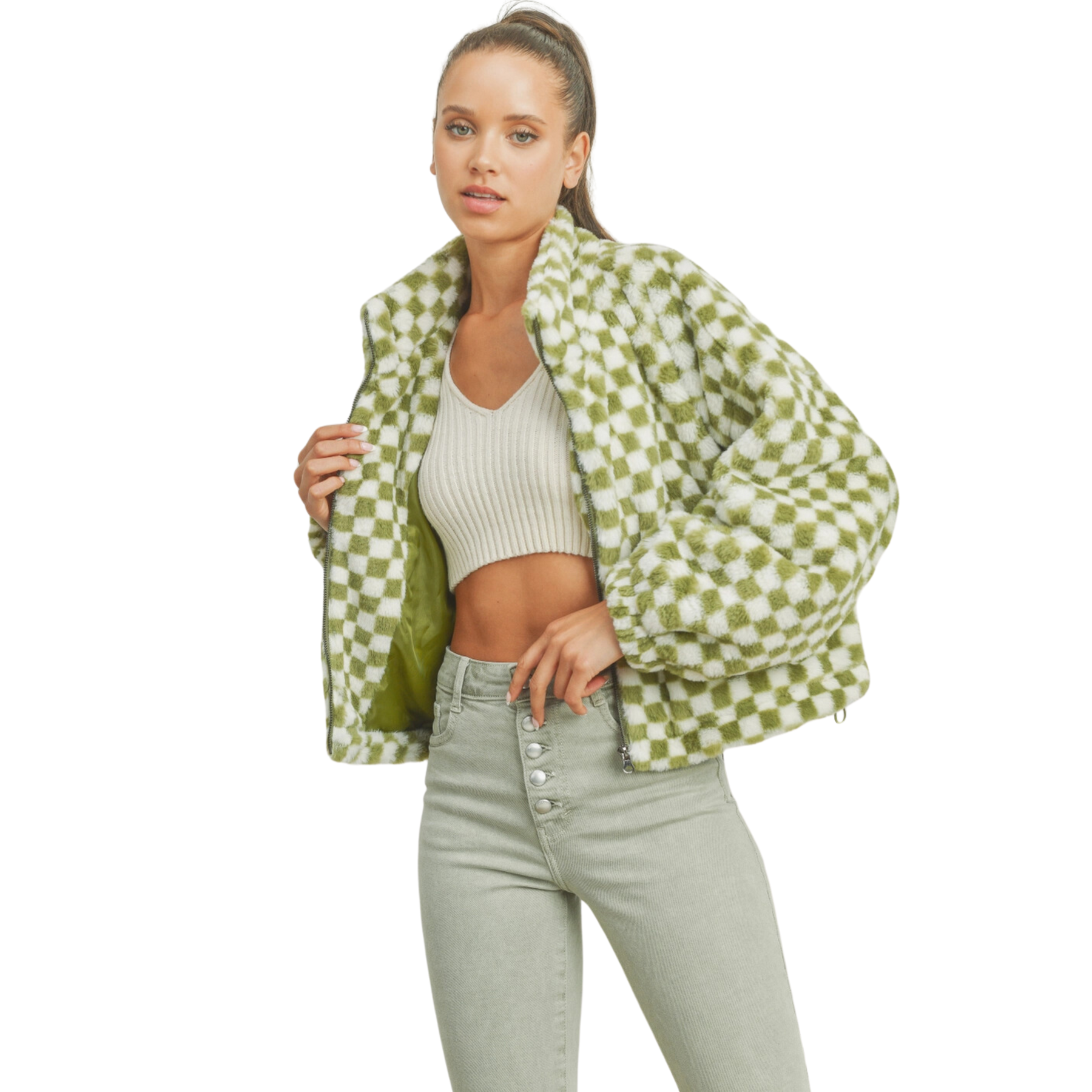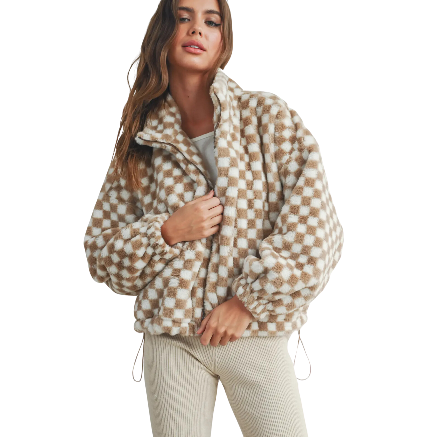 Checker Teddy Fall Jacket – a cozy blend of fall comfort and trendy style. This jacket seamlessly combines a classic checker pattern with the plush warmth of teddy fabric, making it a must-have addition to your seasonal wardrobe. 100% POLYESTER. Hand wash separately in cold water. Do not machine wash. Do not bleach. Lay flat to dry. Cool iron if necessary.