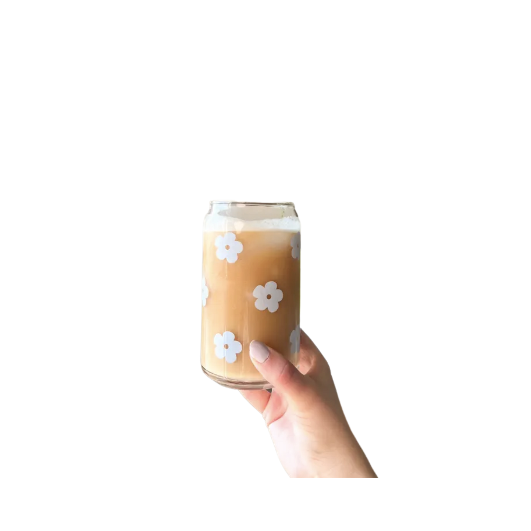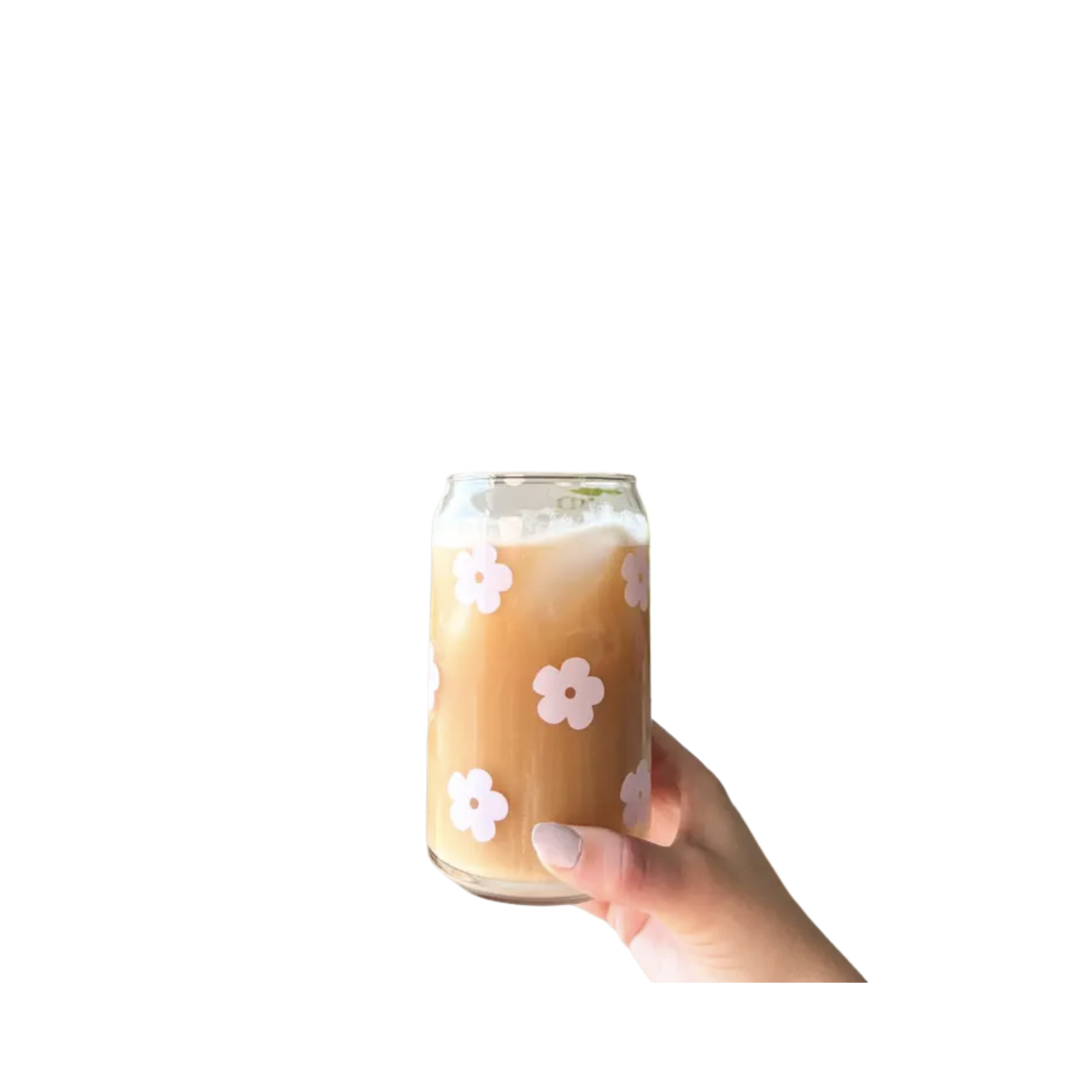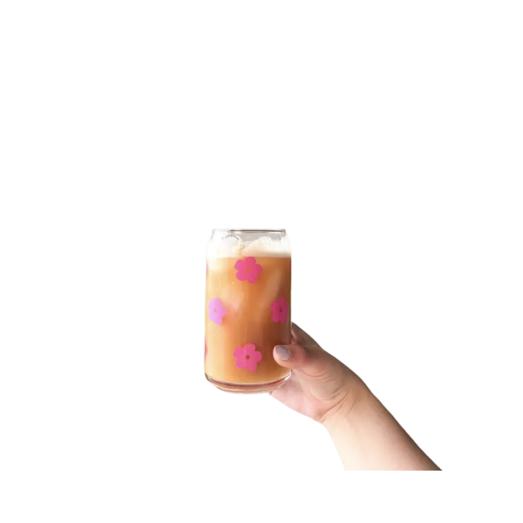 Glass cup with pink floral design. This 16 oz can glass cup is a great choice for hot and cold beverages. Its Daisy design is printed seamlessly around the glass with high-quality, durable ink for long-lasting durability. Plus, it is dishwasher safe and can last through more than 300 dishwasher cycles on the top rack.