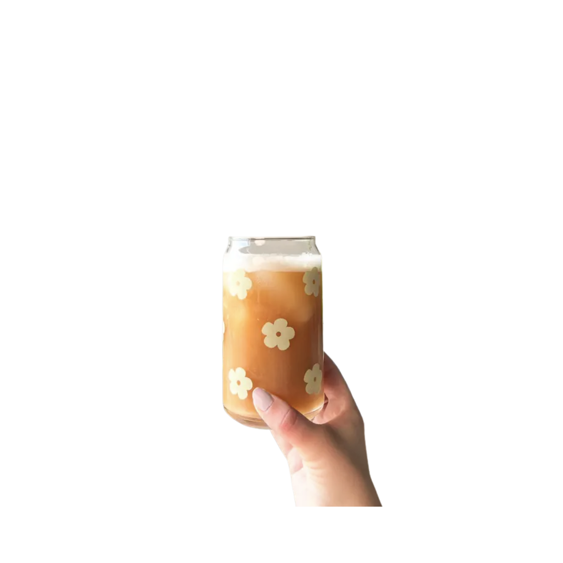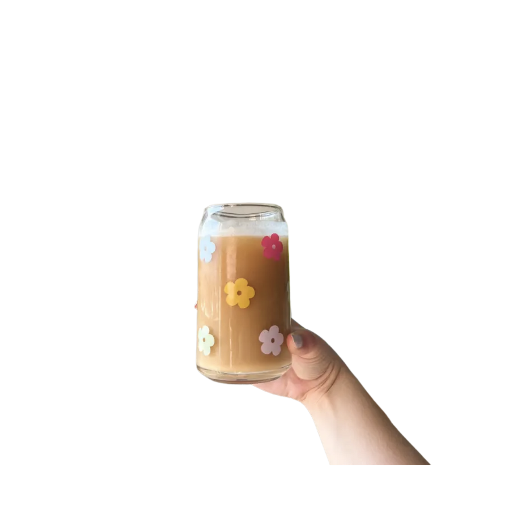 Glass cup with multicolored floral design. This 16 oz can glass cup is a great choice for hot and cold beverages. Its Daisy design is printed seamlessly around the glass with high-quality, durable ink for long-lasting durability. Plus, it is dishwasher safe and can last through more than 300 dishwasher cycles on the top rack.