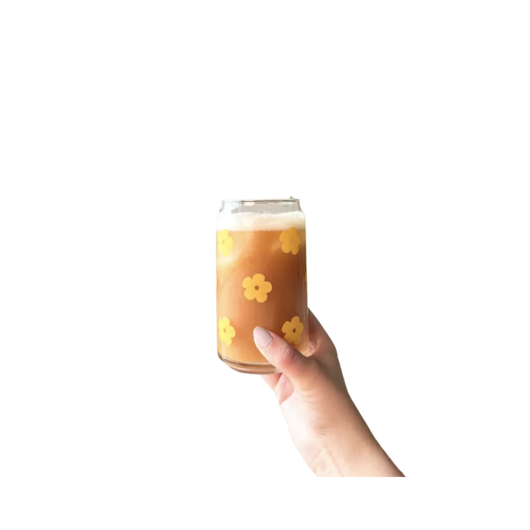Glass cup with yellow floral design. This 16 oz can glass cup is a great choice for hot and cold beverages. Its Daisy design is printed seamlessly around the glass with high-quality, durable ink for long-lasting durability. Plus, it is dishwasher safe and can last through more than 300 dishwasher cycles on the top rack.