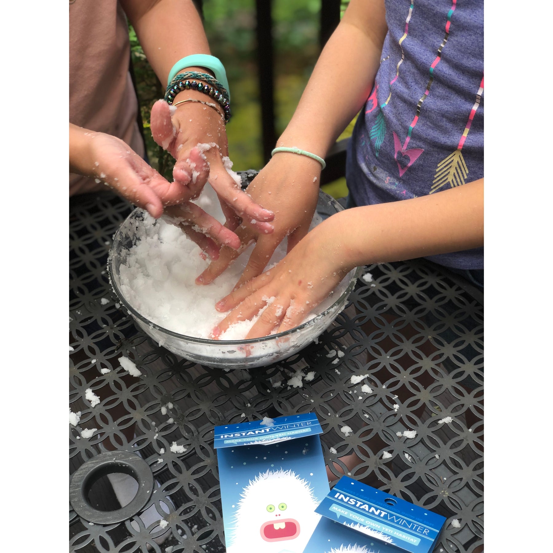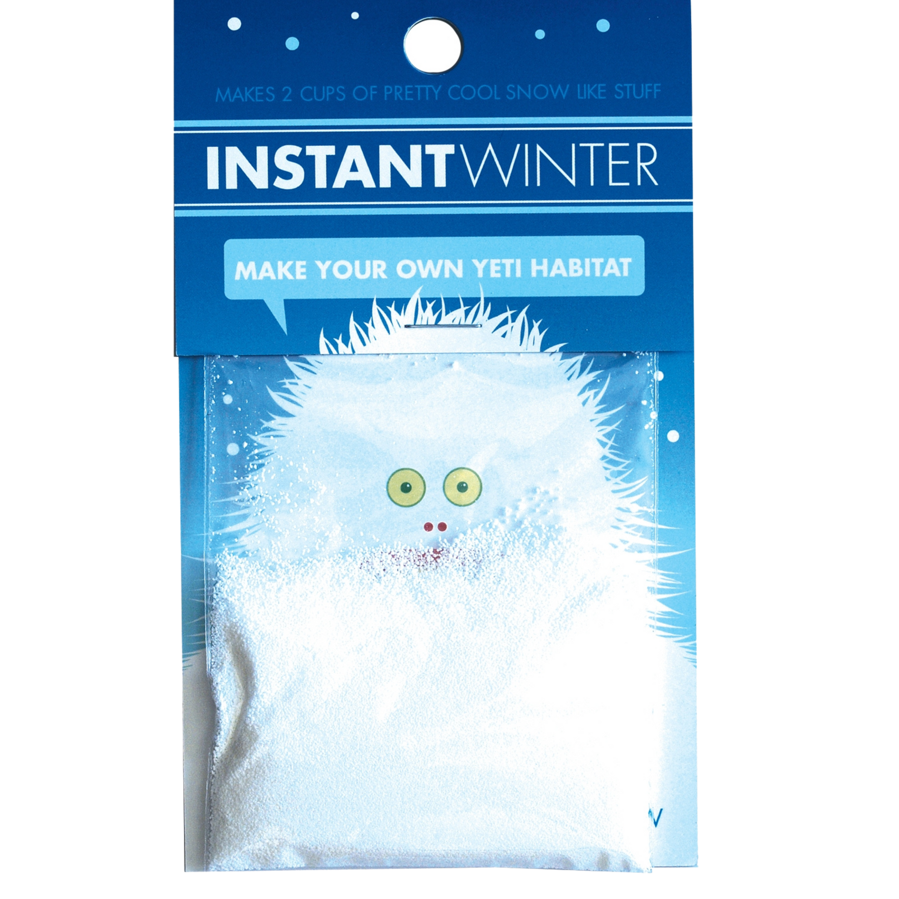 Create winter fun and ponder polymers. Makes ~2 cups of cool snow-like stuff with volume swelling and water absorbing properties. Hands-on science and a great sensory activity. Perfect for yetis and chilly chemists!