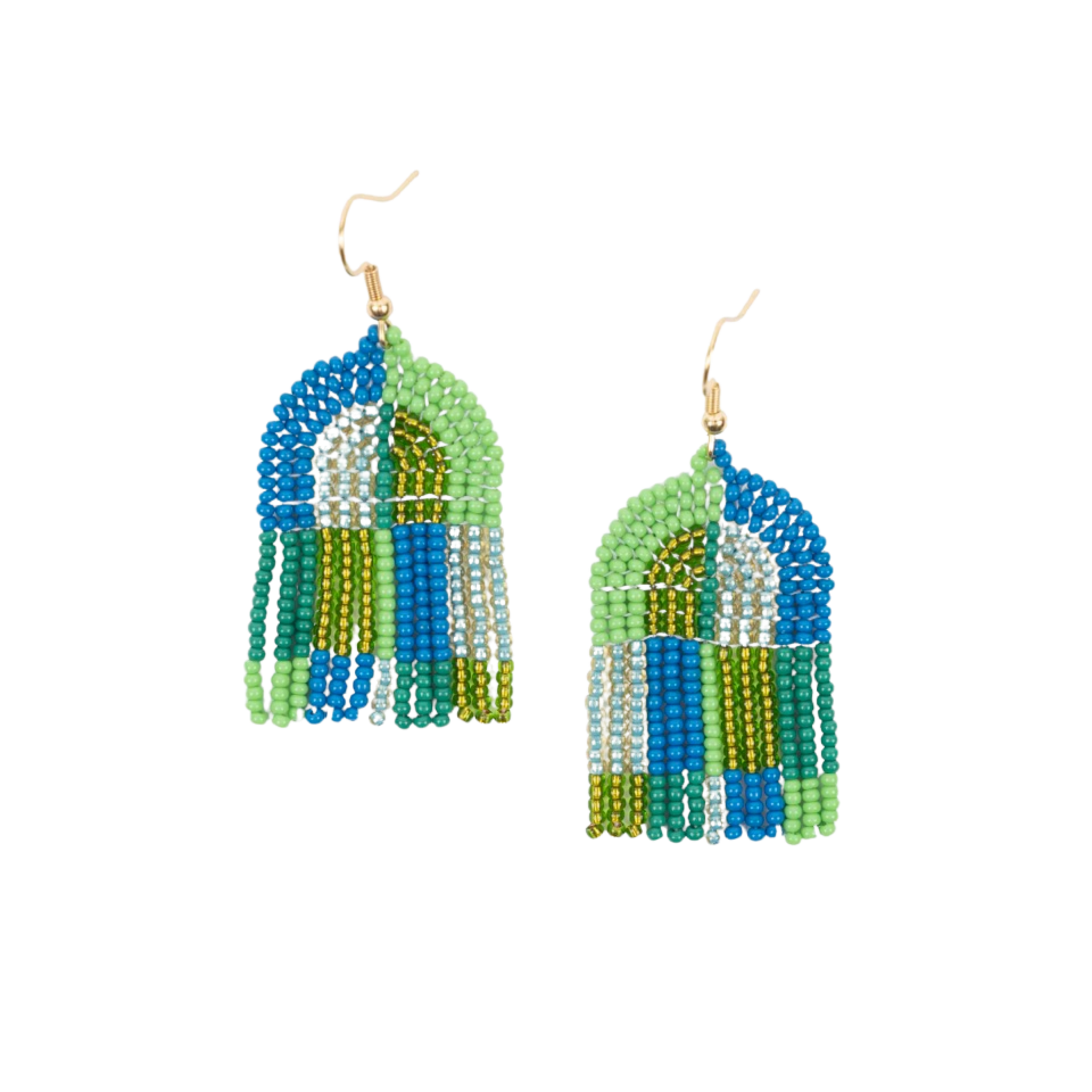 A little arc of pure joy. These 2.5" earrings are hand-crafted with intricate glass beadwork, forming a vibrant patchwork of bright colors and playful patterns. Lightweight and full of personality, they’re finished with gold-plated French hook ear wires for easy, everyday wear.