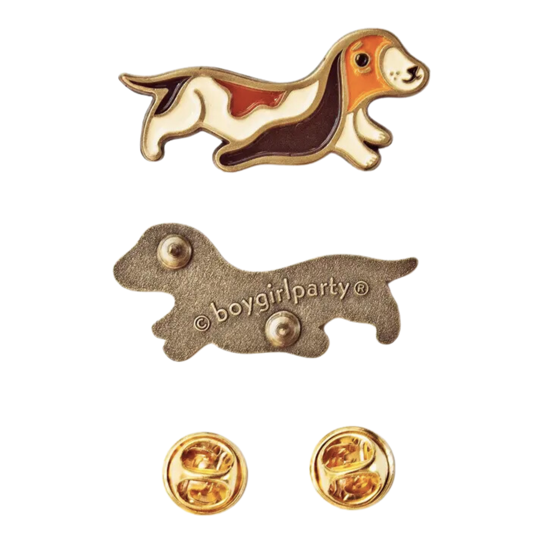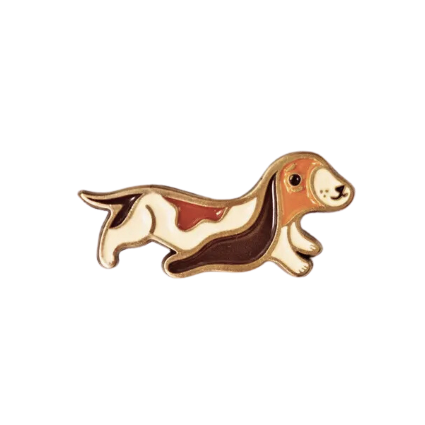 Basset hound enamel pin! This charming pin is made of brass-tinted metal and four colors of enamel. Brooch measures approx 1.5" wide. Packaged on a backing card in a protective sleeve! Please be advised that this pin has small parts (butterfly clasp on the back) and is not made for children.